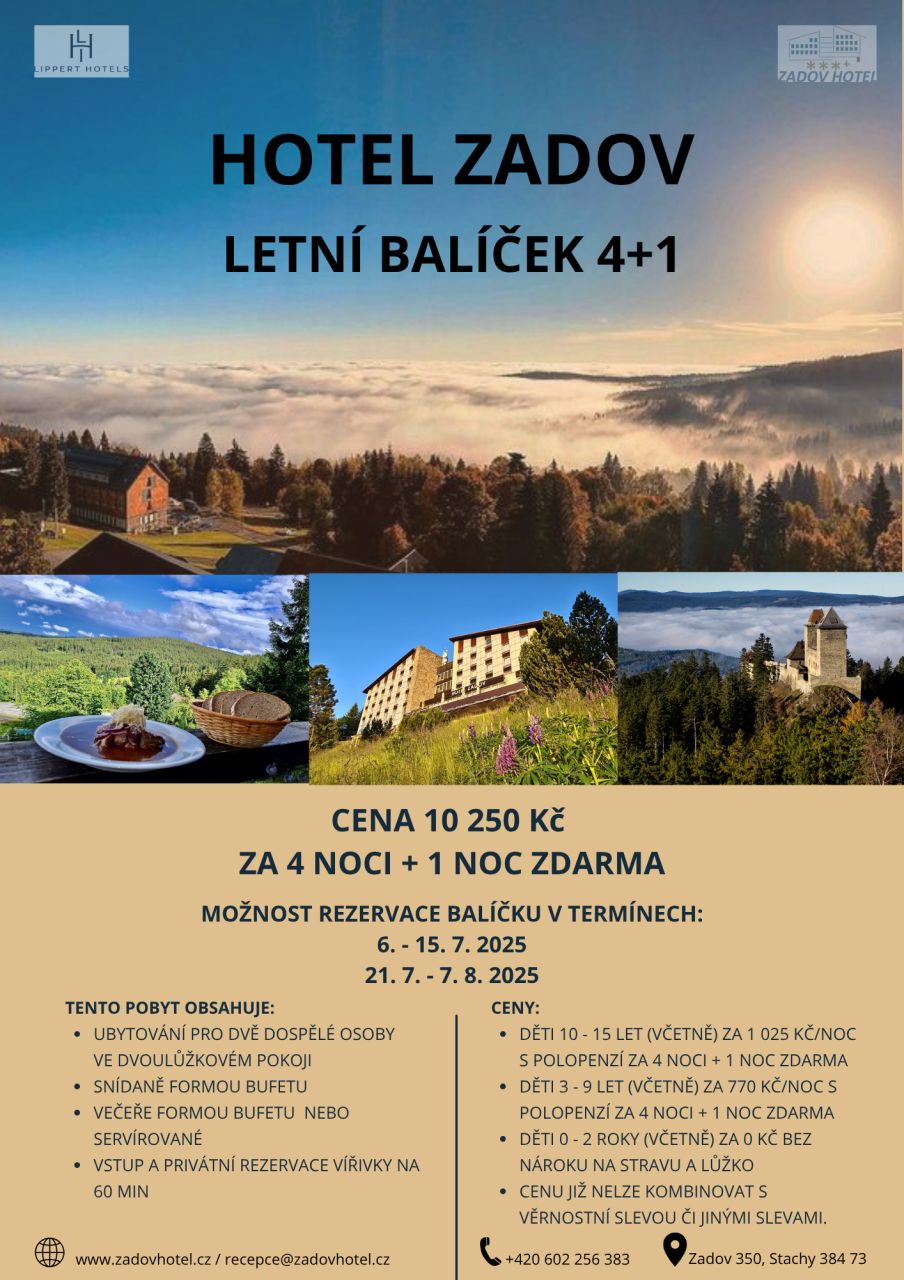 BALÍČEK 4 + 1 Léto 2025UBYTOVÁNÍ PRO 2 OSOBY VE DVOULŮŽKOVÉM POKOJI NA 4 NOCI (A 5. NOCÍ ZDARMA) Cena balíčku: 10 250 Kč Termíny pobytu v rozmezí: 6. – 15. července 2025 Balíček dále obsahuje: snídaně formou bufetu večeře formou bufetu nebo servírované menu Privátní vstup do vířivky na 60 minut pro dvě osoby Cena balíčku: 10250 Kč | ||||